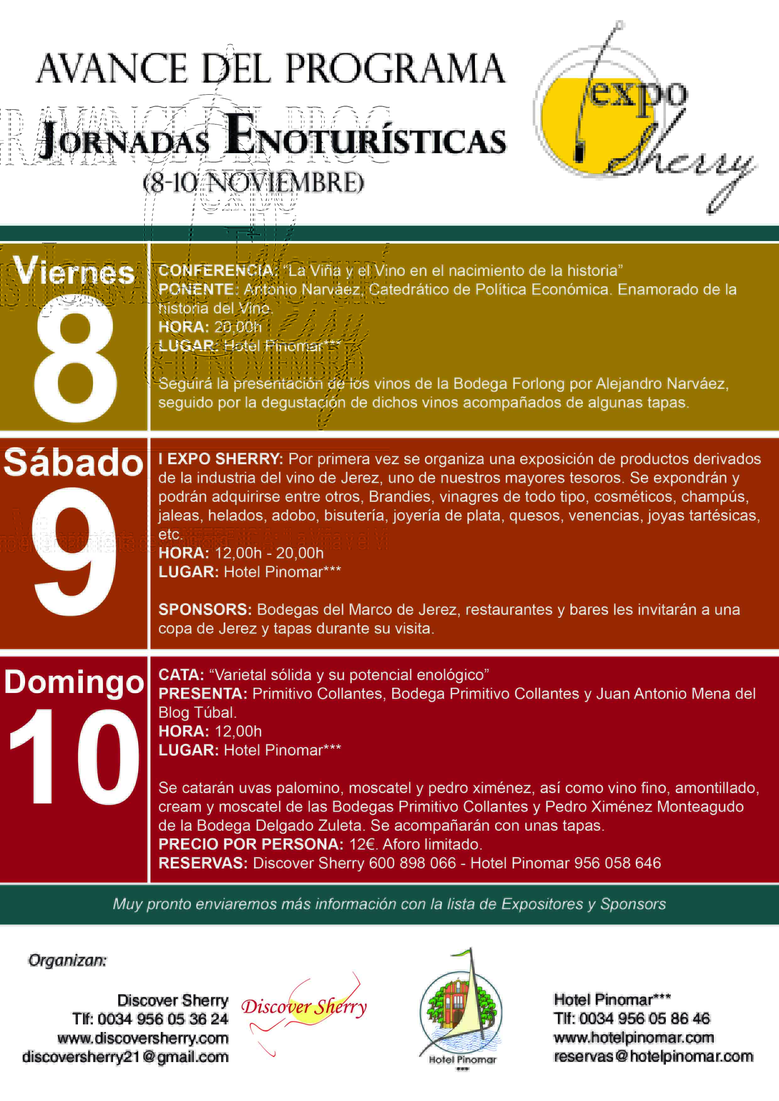 Discover Sherry y Hotel Pinomar hemos organizado unas Jornadas Enoturísticas con motivo de la celebración del día del Enoturismo Europeo. Habrá una conferencia, una cata, y por primera vez una EXPO SHERRY donde se expondrán productos derivados o relacionados con nuestro vino de Jerez. Aquí os adelantamos información sobre el evento. Muy pronto os enviaremos la información completa con la lista de expositores y patrocinadores. ¡¡No os lo podéis perder!!