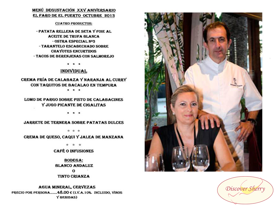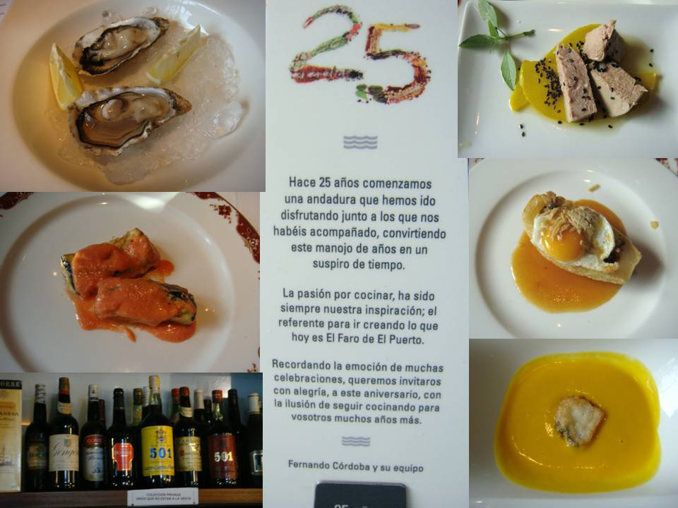 El Faro de El Puerto celebra su XXV aniversario este año con un menú degustación que cambia cada mes. Fernando Córdoba es el propietario y chef. Antes ya trabajó con su padre en el Retaurante El Faro de Cádiz por lo que su arte y amor a la buena cocina le viene de familia.