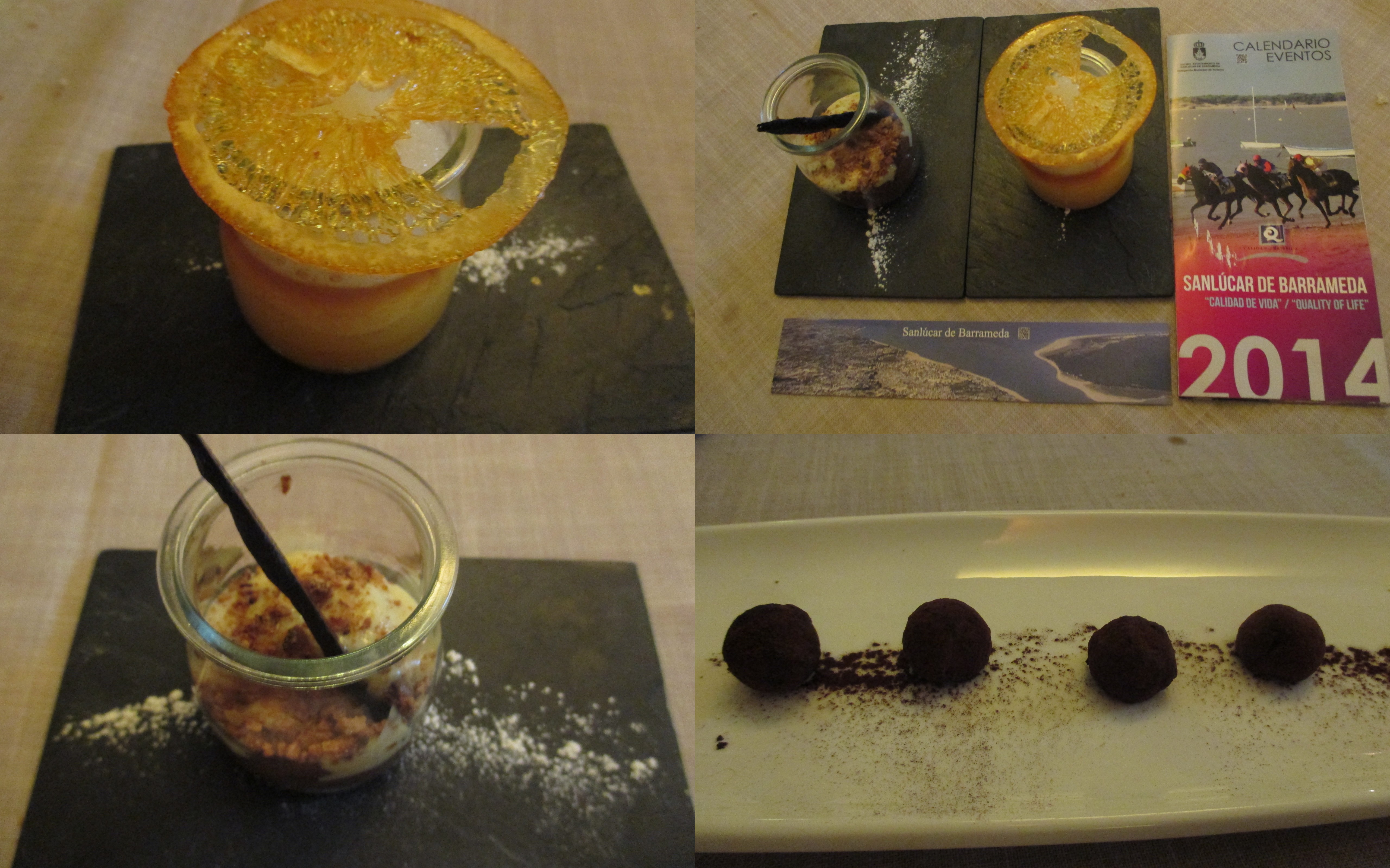 Los postres, deliciosos. Una crema de nocilla con esencia de avellana de los toros, un nombre con el que se describen en Sanlúcar las avellanas que uno compraba cuando iba a los toros. También probamos un tocino de cielo con espuma de mango y maracuyá. Los dos estaban muy buenos. Terminamos con unas trufas de cacao.