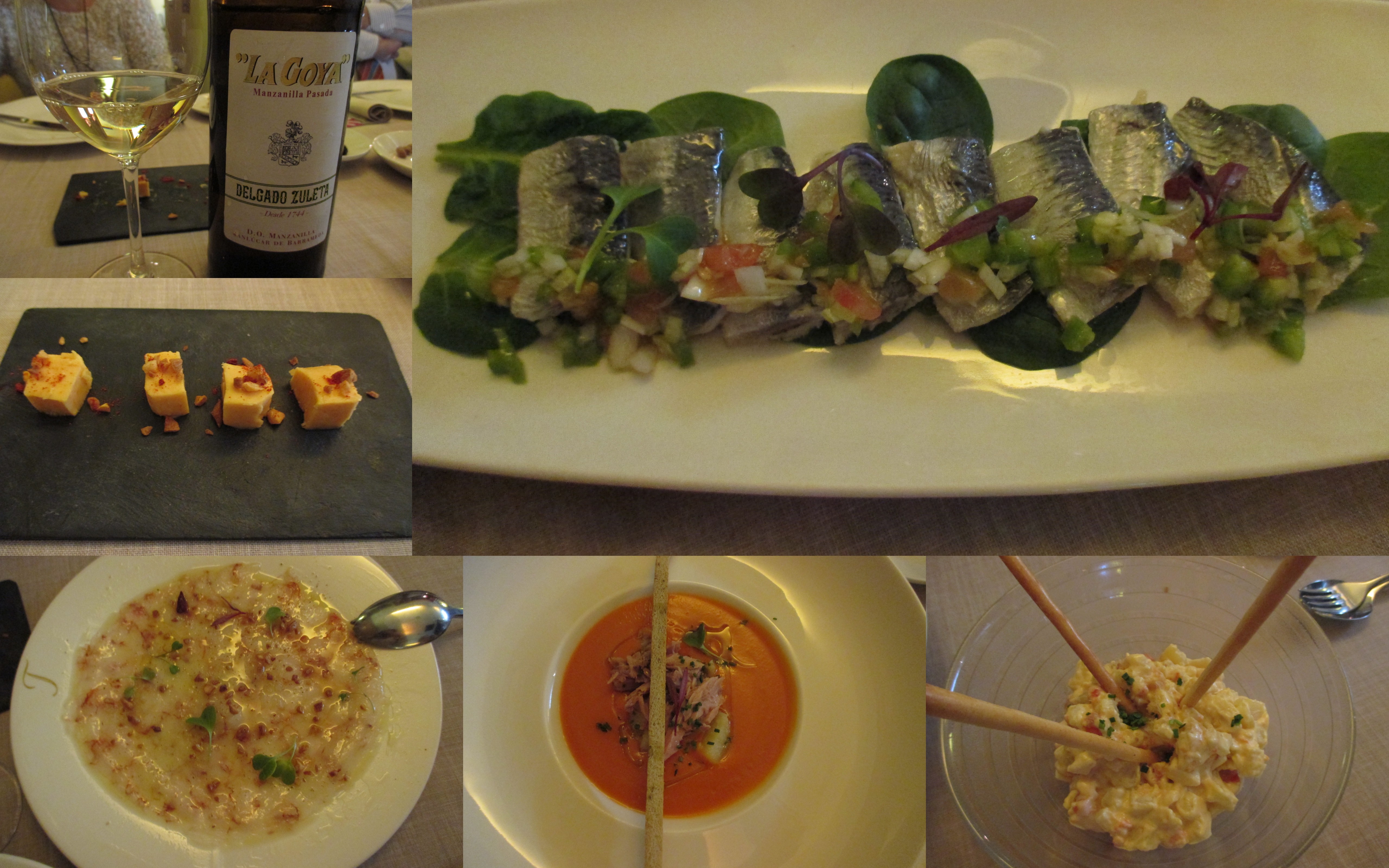 Empezamos con la mantequilla de colorá y el pan de pueblo casero. El menú degustación lo dejamos en manos del chef y no nos decepcionó en absoluto. La mayoría de los productos son de Sanlúcar de Barrameda y José le pone su toque especial. Empezamos con unos lomitos de sardinas, un carpaccio de gambones, el salmorejo de pimientos asados con ventresca y la ensaladilla sanluqueña, no sabría decir cuál me gustó más. Todo ello lo armonizamos con manzanilla La Goya, una de las mejores manzanillas de Sanlúcar. Me llamó la atención la carta de manzanillas que tienen en Surtopía, no sabía que había tantísima variedad y las tienen todas.