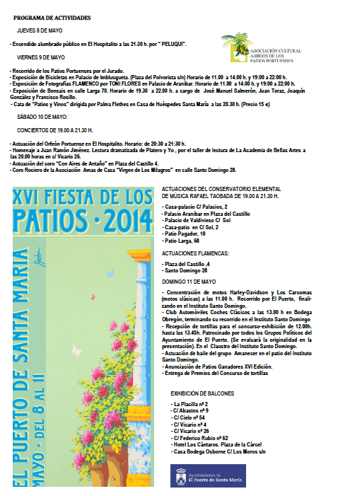 To see pictures of patios and activities which have been part of past Fiesta de los Patios, log-on to the Association´s website: www.patiosportuenses.com.es, or go to their Facebook page at www.facebook.com/patios.portuenses , or visit their blog at amigosdelospatiosportuenses.blogspot.com.es.