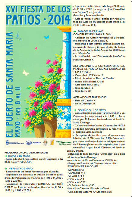This year, from the 8th to the 11th of May, the Fiesta of Patios will be celebrated in El Puerto. In speaking with Sr. Nani Delgado Poullet, President of the Friends of Patios Association, we were surprised at the variety of activities that will be offered in conjunction with the “open house.” As it was explained to us, there is a printable map that is available on-line and which identifies the homes with patios that will be open for visits. Within most of the patios, every visitor will be welcomed and offered at least a complimentary glass of fino sherry and, at some, a tapa as well. Some patios will have exhibits, for example, of vintage bicycles, photography, antiques, or even bonsai trees. On Saturday, the 10th, other patios will host performances by flamenco dancers, classical musicians, jazz musicians, chorale singers, flamenco singers, and flamenco guitarists. On Sunday, the 11th, there will even be a promenade, through the streets of El Puerto, celebrating this event and featuring vintage automobiles and motorcycles. Also on Sunday, the 11th, at 2 p.m. there will be a Spanish tortilla contest at the Instituto Santo Domingo, along with a Flamenco dance performance.