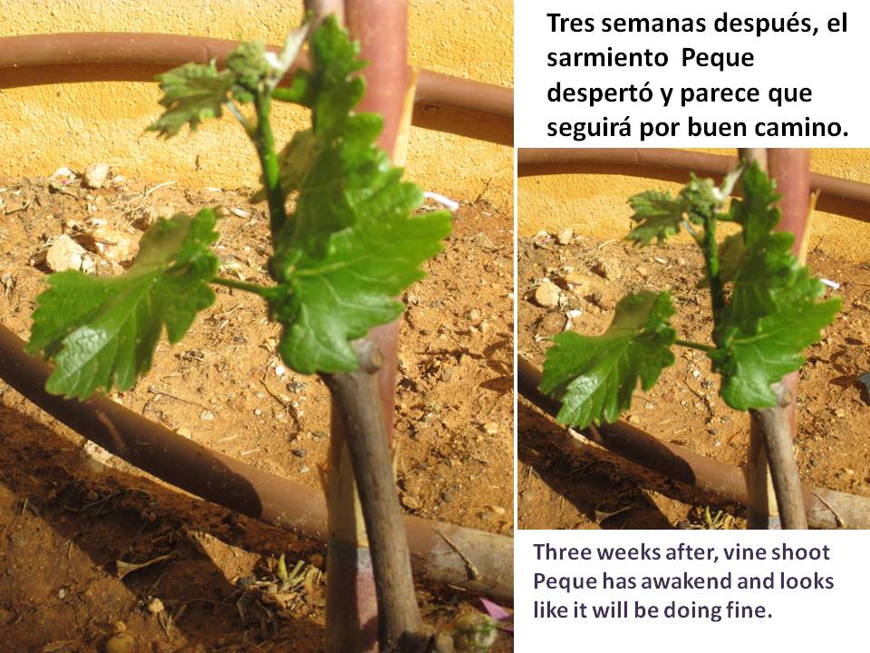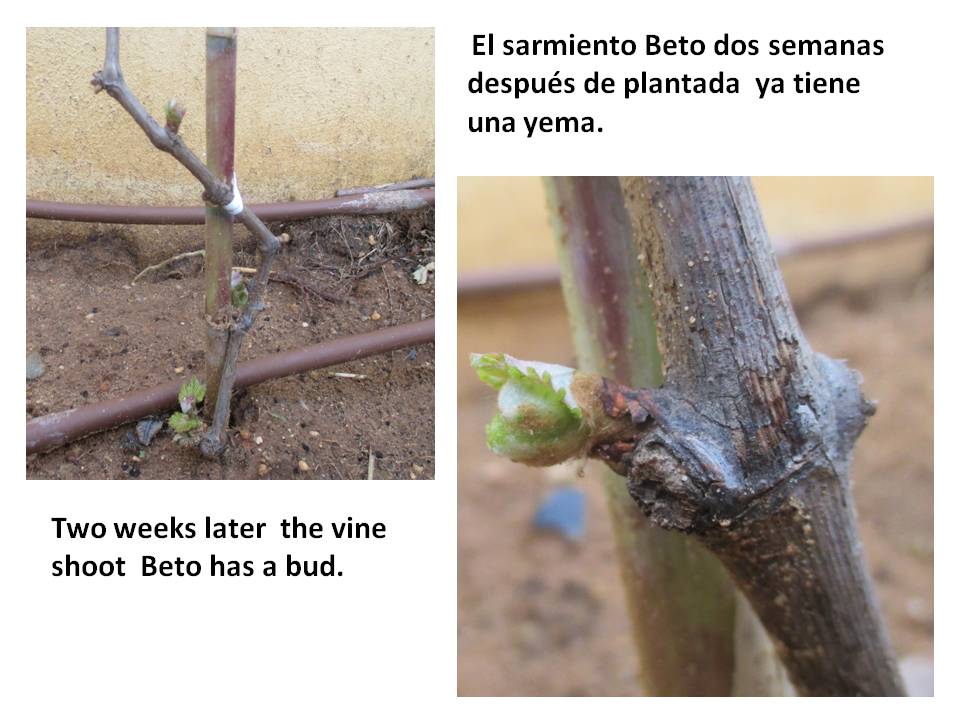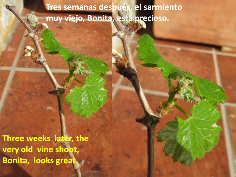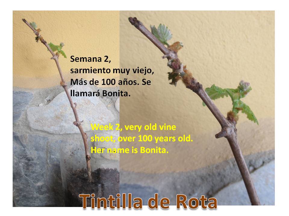 La Tintilla de Rota fue la única uva tinta que sobrevivió a la filoxera. Hasta hace poco se usaba para hacer vinos tintos dulces. José Antonio Rodríguez Muñoz, más conocido por sus amigos como Peque, es un enólogo experto en este tipo de uva con la que hace su vino de mesa seco, “Clérigo”. Nos regalo hace unas semanas dos sarmientos de unos 30 o 40 años que él mismo plantó en nuestro jardín y uno de probablemente más de 100 años que han encontrado en una finca de Rota. Las estamos siguiendo en su crecimiento y es muy emocionante.