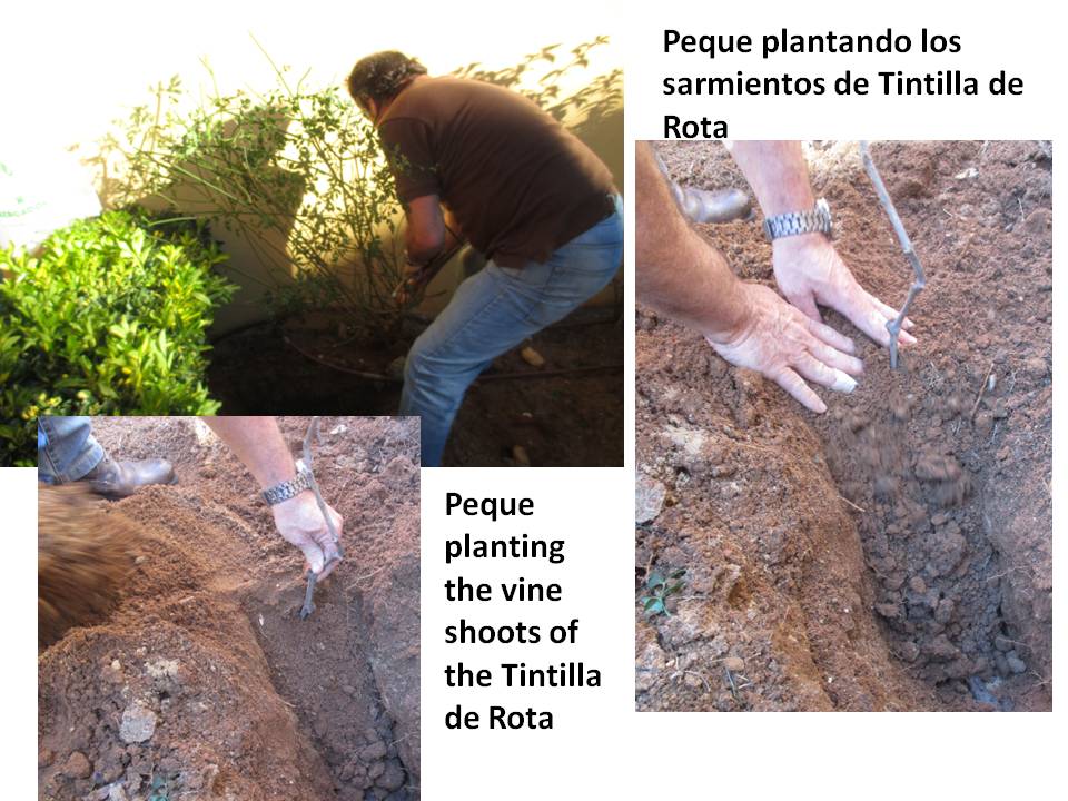 The “Tintilla de Rota” grape variety was the only red grape that survived the filoxera plague. Up to recently it was used to only make sweet red wines. Jose Antonio Rodríguez Muñoz, better known to his friends as “Peque,” is an expert oenoligist in this type of grape and from which he makes his dry, table wine under the name “Clerigo.” A few weeks ago, he gave us some 30 to 40 year-old shoots which he personally planted in our garden. He also gave us a shoot that is from a vine that is probably over 100 years old and which he found growing wild at an abandoned vineyard in Rota. We are following their growth and we are very excited about them.