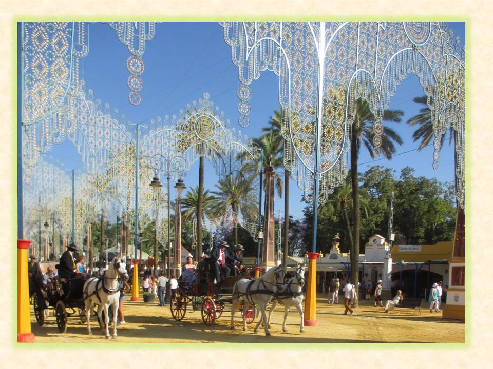 Pues eso hice.  Le conté la tradición de la Feria, las costumbres, que eran las sevillanas, le enseñé a bailarlas en 5 minutos, brindamos, bebimos fino, le hablé de la varierad tan grande de los vinos de Jerez y dijo que quería probarlos todos.  En fin solo tuvimos que repetir un par de cosas por la música demasiado alta de alguna caseta y parece que todo salió bien.