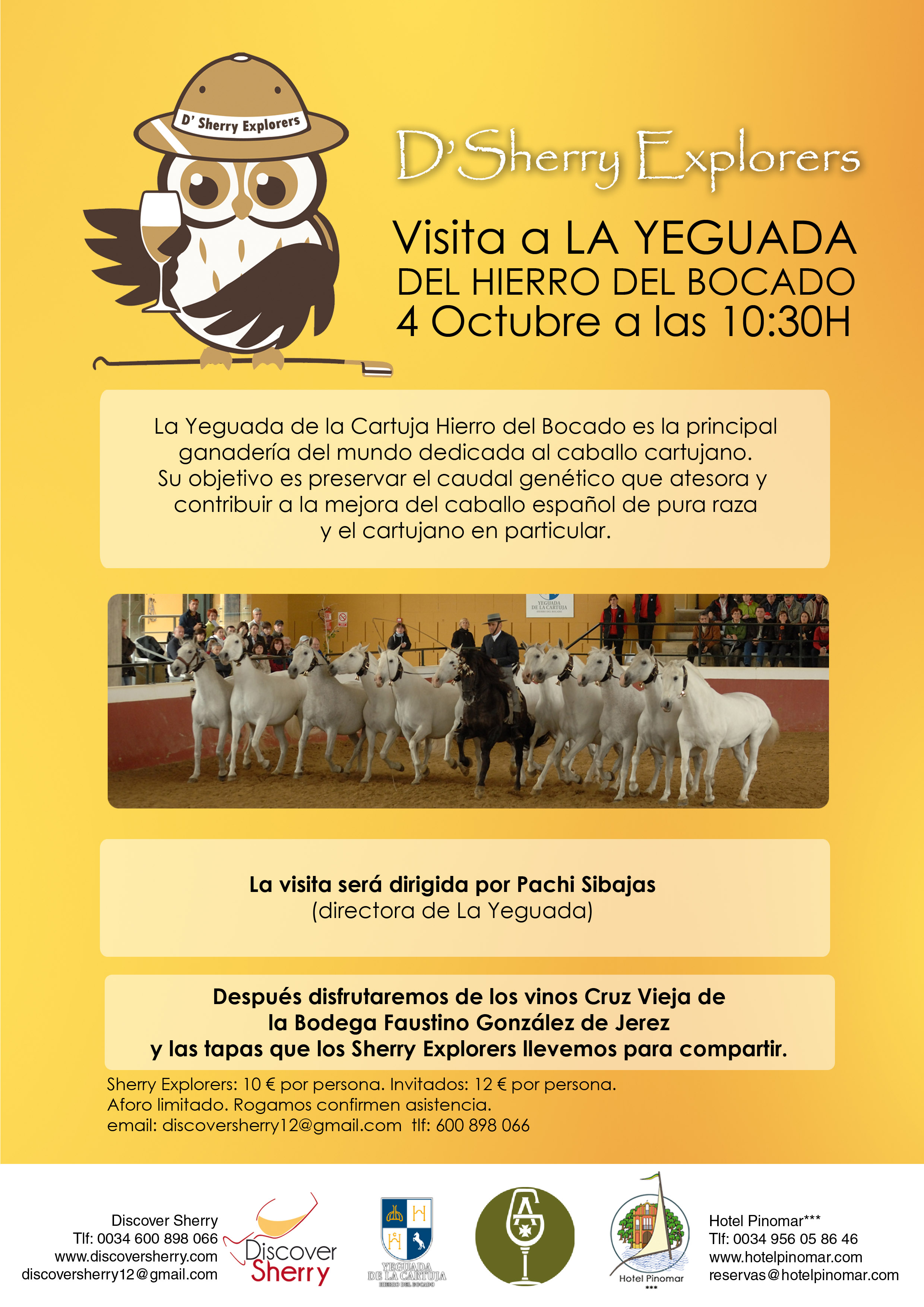Aquí os paso la información de la siguiente actividad de los Sherry Explorers y amigos. Nos harán una visita privada dirigida por Pachi Sibajas que además de directora es también una Sherry Explorer. Jaime González nos presentará sus vinos Cruz Vieja de su bodega Faustino González (También es Sherry Explorer). Todos llevaremos algo para picar y compartir. Será una mañana presciosa con caballos, jereces y buena compañía.