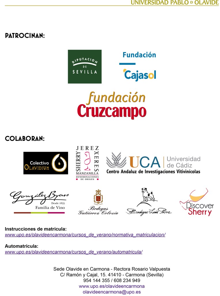Este año la Universidad de la Universidad Pablo Olavide ofrece en sus cursos de verano en la sede de Carmona un curso dedicado a la región de Jerez. Aquí os paso el programa que como veréis es interesantísimo. ¡Sherry Explorers, no os lo perdáis! También os adjunto el programa de todos los demás cursos que se ofrecerán por si os interesan.