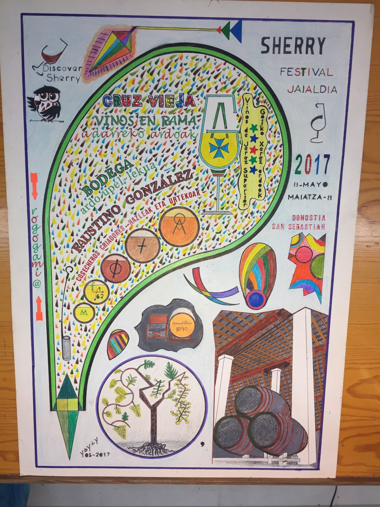 Fernando Ibiltzieta is a new Sherry Explorer from Navarra. One of his hobbies is painting and we wanted to share this amazing drawing which was inspired by the events of the Sherry Festival in San Sebastián. We were very impressed that our Discover Sherry logo and our mascot EDU were both incorporated into his drawing. Thank you very much, Fernando, for making us part of your work of art and thank you very much, Rocío, (owner of the drawing) for allowing us to share it with our readers.