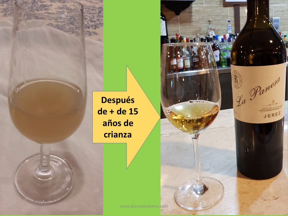 Empezamos la charla con una copa del mosto del año sacado esa misma mañana del depósito donde aún estaba en fase de deslío y que no entrará en bodega hasta enero. Es aún un mosto, un jugo de uva con 11´85º, sin alcoholizar. Después de más de 15 años en bota y bajo velo de flor se convertirá en uno de los Vinos Genuinos de la bodega Emilio Hidalgo, Fino La Panesa. Hacia el final de la charla disfrutamos todos de una copa de este fino que tiene un color dorado claro ya que la flor se vuelve más fina. En nariz es envolvente e intenso. Boca sabrosa, untuosa, llena. Es un vino perfecto no solo como aperitivo sino para acompañar pescados, setas o carnes ligeras.