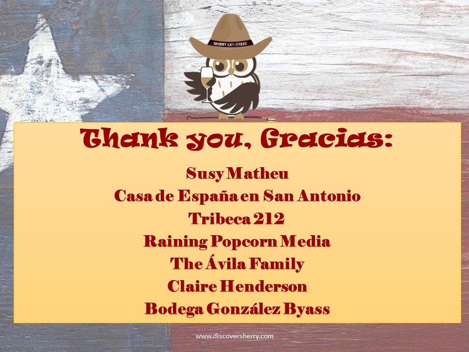 Thank you to everyone who made this marvelous experience become a reality. We have accomplished our mission: we have created new Sherry-wine lovers and we now await your visit to Spain. We hope that you enjoy the attached video that includes some of the photos that were taken that wonderful evening.