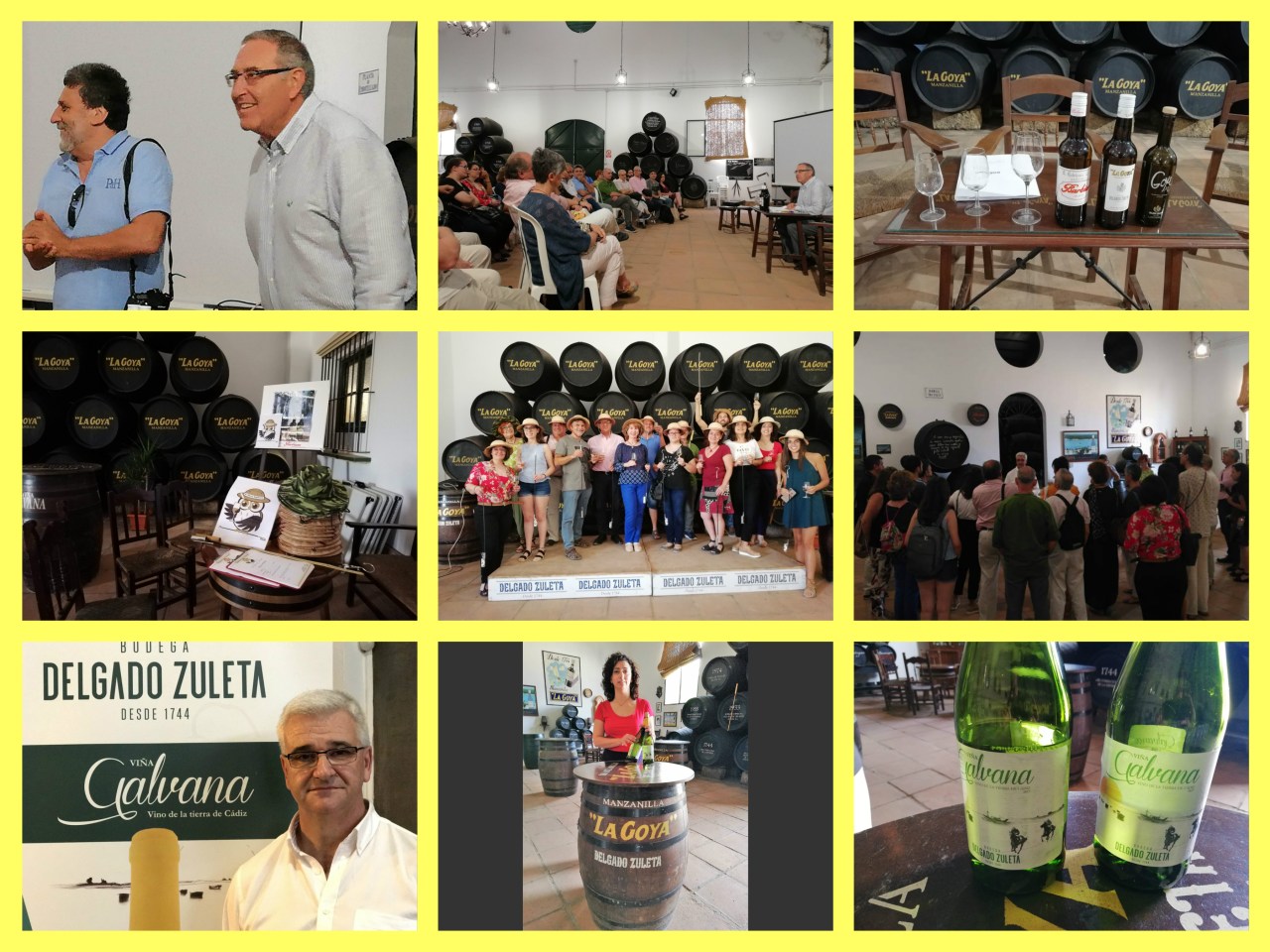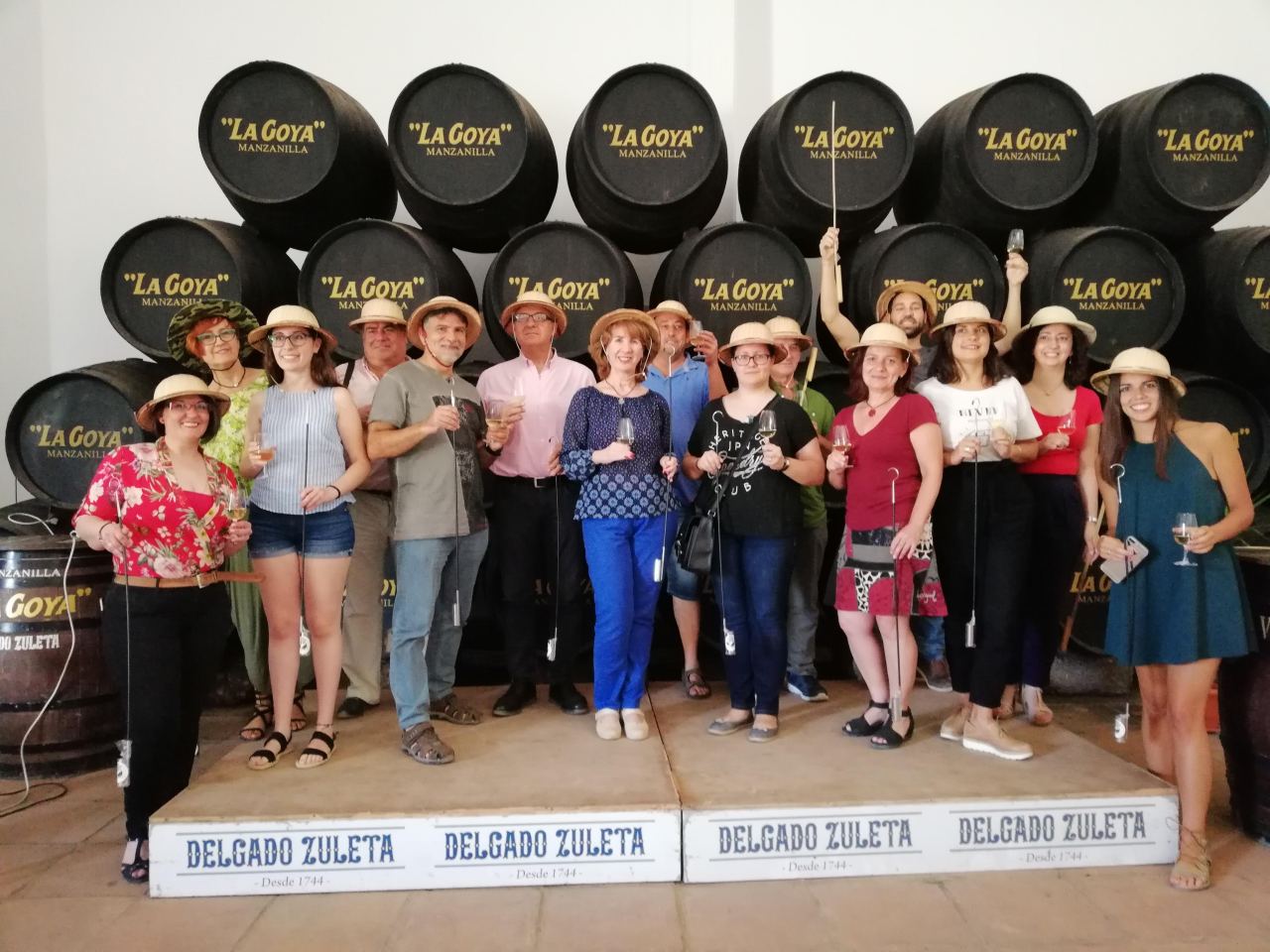 Recibimos a los asistentes al curso y a los catedráticos Juan Jiménez y Andrés Garzón en la Bodega Delgado Zuleta. La primera conferencia estuvo a cargo de Jorge Pascual, Director general de la bodega y que habló del origen de los vinos de Sanlúcar. Seguidamente el enólogo de la bodega, José Antonio Sánchez Pazo hizo una cata a pie de bota por la bodega explicando la evolución desde la manzanilla más joven hasta llegar a la manzanilla pasada La Goya.
