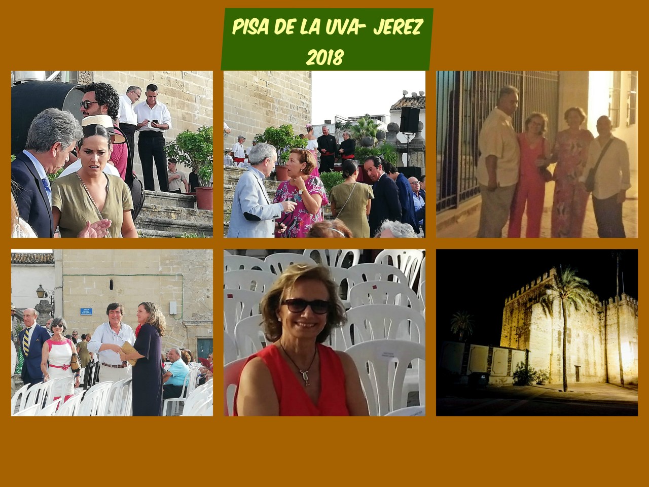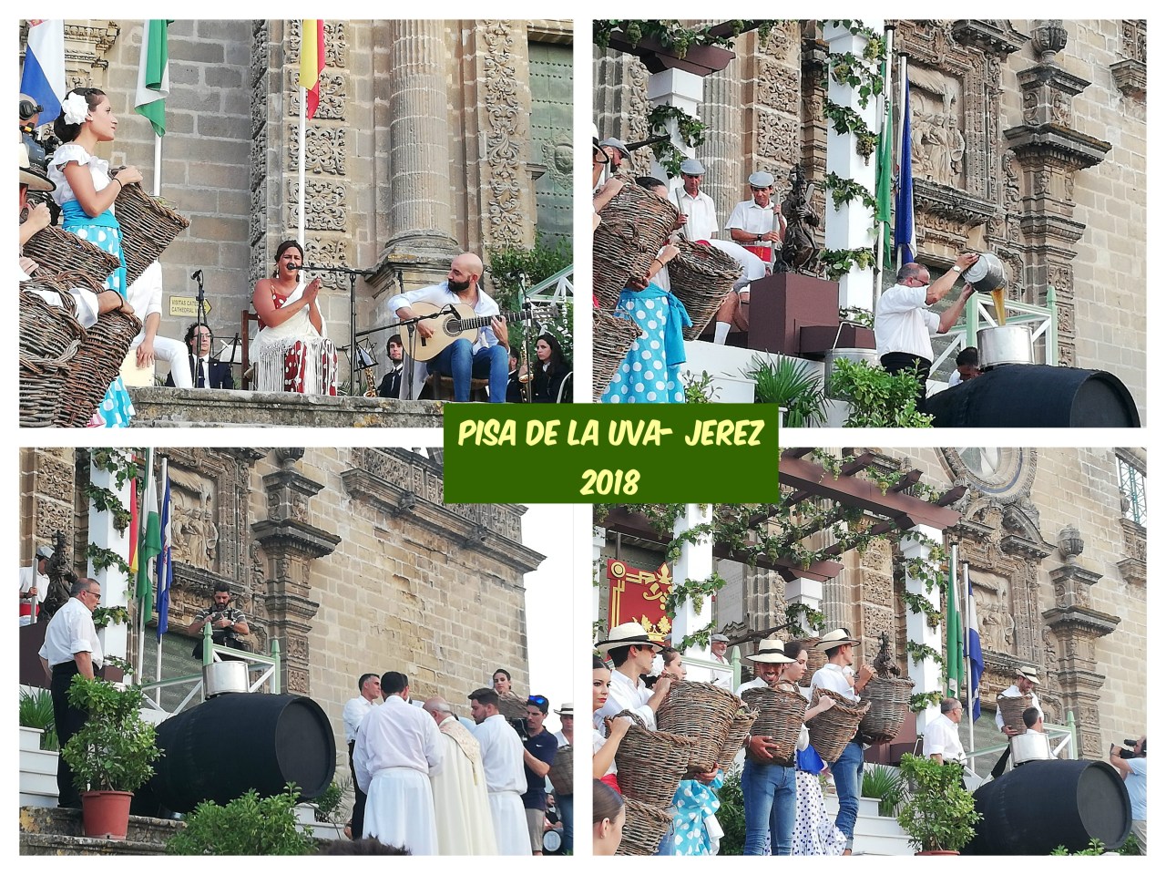 Asistimos al tradicional acto de la Pisa de la Uva frente a la fachada de la Catedral de Jerez. Disfrutamos de la música de la Banda Municipal y de un grupo flamenco. Vendimiadoras y vendimiadores llevaron sus cestas de uvas al lagar donde una cuadrilla hizo la pisa. El primer mosto fue bendecido, repicaron las campanas y la Banda Municipal tocó el himno de la Vendimia y el Himno Nacional.