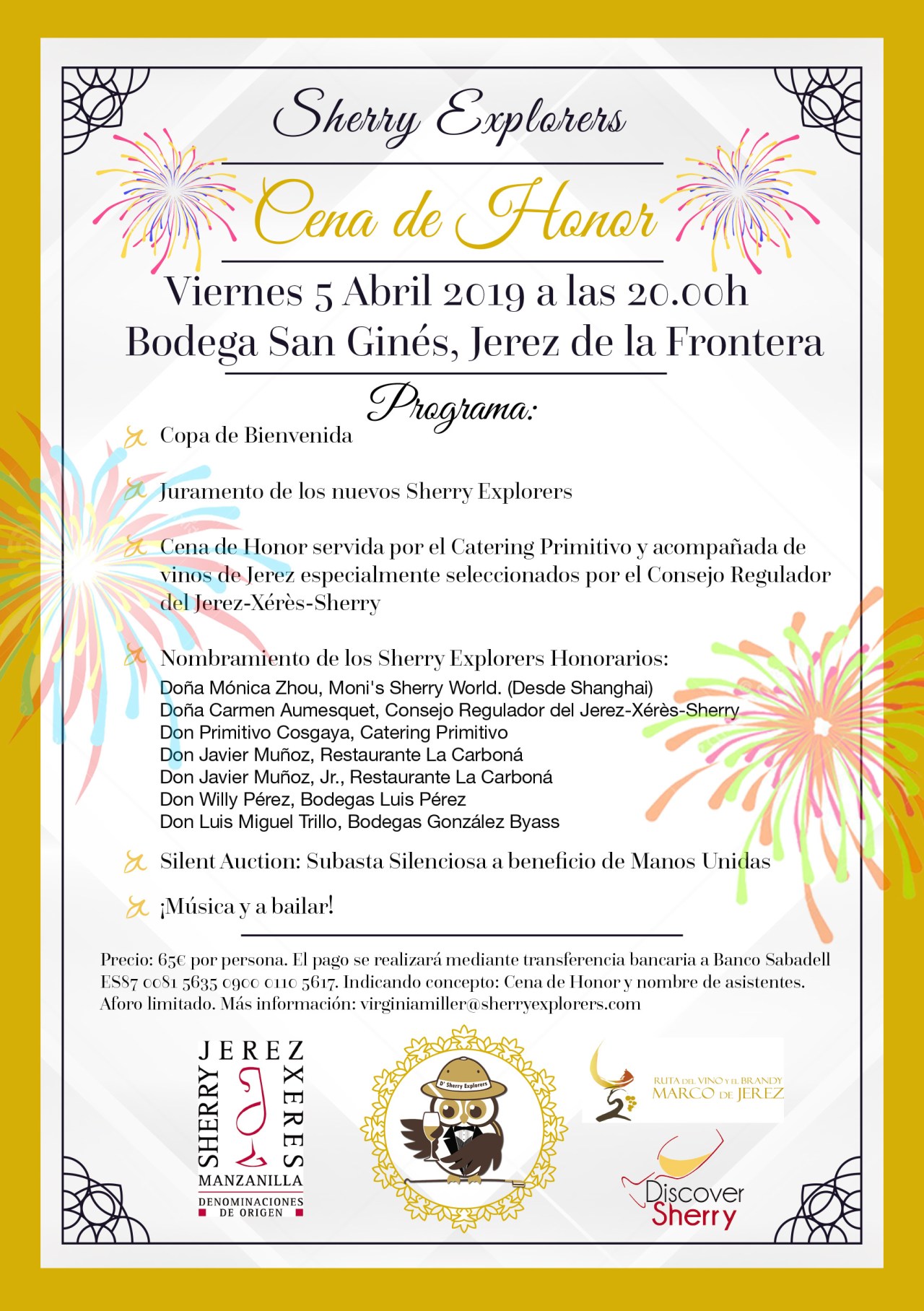 * Será una Cena de Honor fantástica, divertida e inolvidable. *En un sitio mágico: La Bodega San Ginés en el Consejo Regulador en Jerez. *Un menú riquísimo servido por el Catering Primitivo. *Vinos de jerez especiales seleccionados por el Consejo Regulador. *Nombraremos Sherry Explorers Honorarios a un grupo de estupendas personas que hacen una gran labor en el mundo del jerez. *Por primera vez habrá una Subasta Silenciosa a beneficio de Manos Unidas. *Música y animación y mucho baile que no dejará indiferente a nadie. *Y si aún no eres Sherry Explorer…………………..podrás hacer tu juramento!! ¡Haz tu reserva y anima a tus amigos!