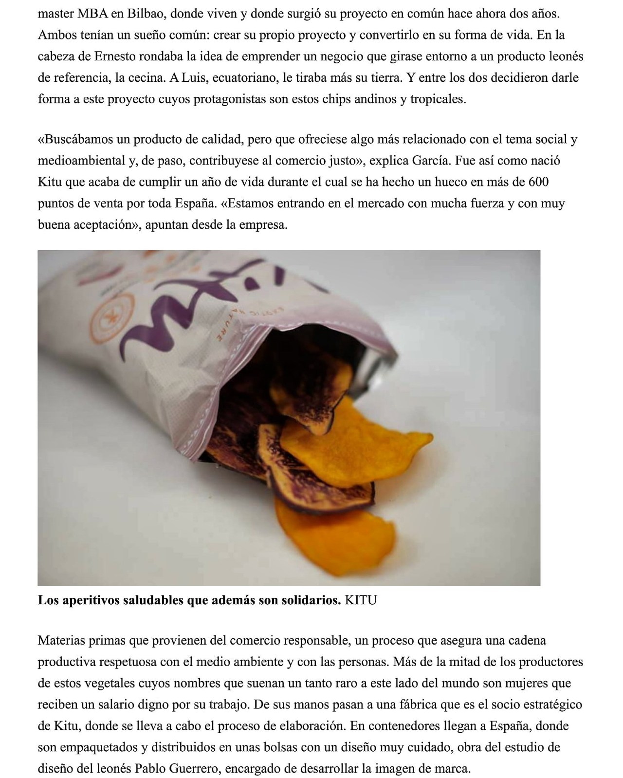 We highly recommend Kitu snacks! They are healthy appetizers that are tasty and crunchy. They originated in the Andes mountains in Ecuador where the plantain, Andean white carrot, the tropical yucca, the purple yam, and the Andean beet root are all harvested and prepared like a “slow food.” Ernesto García, who is the son of our Sherry Explorer in the City of León, Charo Marqués, is one of their creators. We have tried some of the Kitu snacks along with a glass of Fino Sherry and they were fantastic! Attached is an article, in Spanish, that appeared in the Diario de León newspaper and which tells the story about these very unique appetizers. The English version of Kitu´s website can be found at: https://kitusnack.com/en/