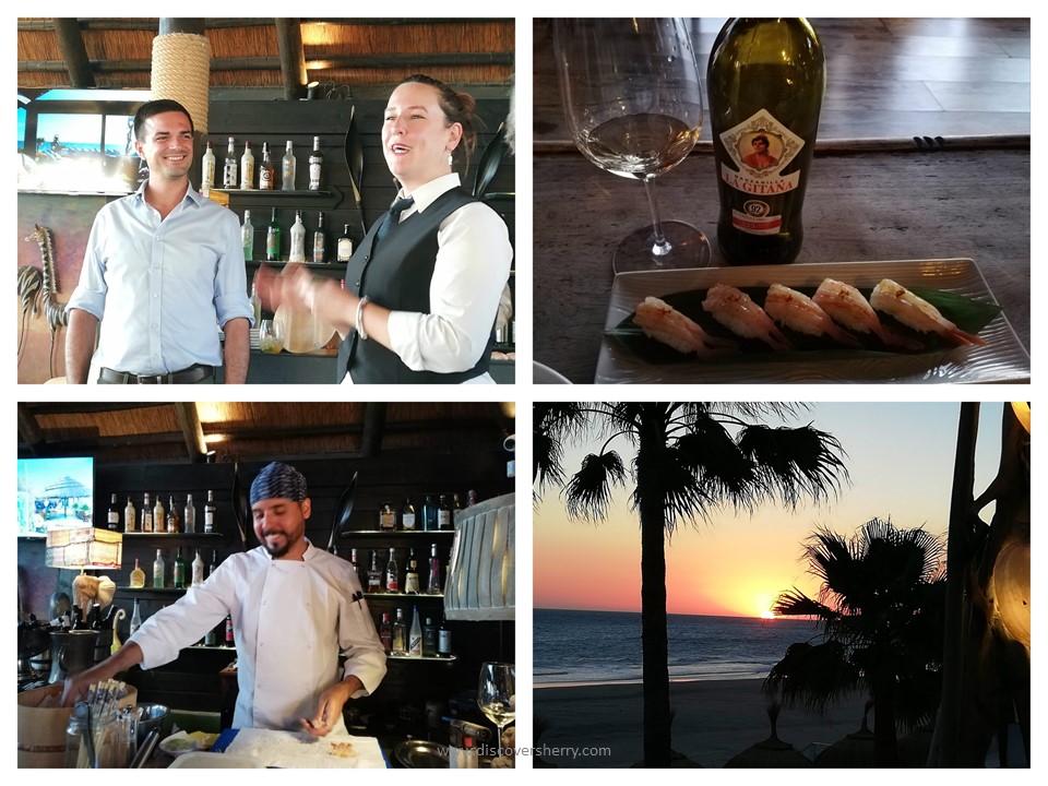 A tasty mojito made with Napoleón amontillado sherry was part of the welcome greeting, upon our arrival at the Ajedrez Beach Club for the Hidalgo Winery wine tasting. Once we made ourselves comfortable in the “sunset-view” room we tried our next wine. It was “Las 30 del Cuadrado”, a wine made from very old vine-stock. We paired it with some oysters and some red mullet flambé nigiri sushi seasoned with some caviar salt. (I apologize, but when I remembered to take the photo I had already eaten the oyster!)