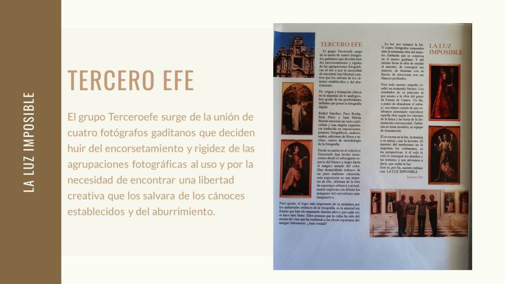 Los fotógrafos del colectivo Tercero Efe, Rafael Pérez, Rafael Sánchez, Francisco Rocha y Juan Martin Beardo, han dedicado dos largos y atareados años a plasmar su lectura del maestro Zurbarán. En la exposición se mostraban 27 fotografías digitales grandes que recrean pinturas de Zurbarán.