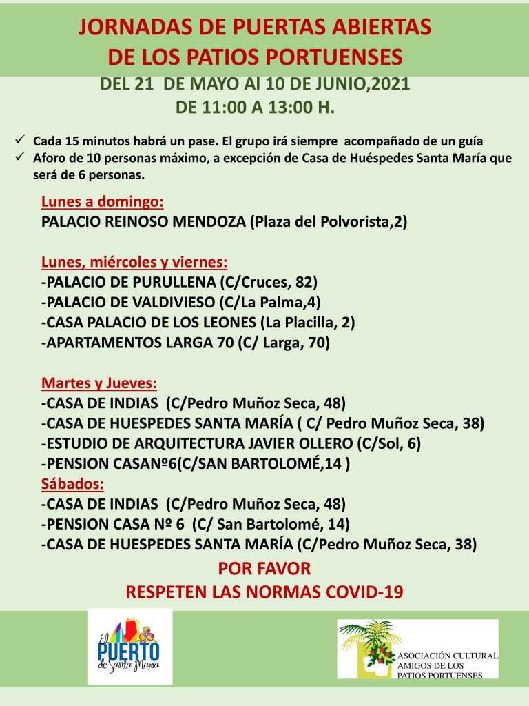 Jornadas de Puertas Abiertas de Los Patios Portuenses By Discover Sherry05/21/2021 DEL 21 DE MAYO Al 10 DE JUNIO,2021DE 11:00 A 13:00 H Share this: Share on Facebook (Opens in new window) Facebook Share on Pinterest (Opens in new window) Pinterest Share on LinkedIn (Opens in new window) LinkedIn Share on X (Opens in new window) X Email a link to a friend (Opens in new window) Email Print (Opens in new window) Print Like Loading... Categories: Events / EventosTags: Asociación de Amigos de los Patios Portuenses, Discover Sherry, Fiesta de los Patios Portuenses, Sherry Explorers Related Articles FELIZ AÑO NUEVO . 2026 By Discover Sherry1 month ago Sherry Explorers y Amigos: By Discover Sherry1 month ago Día de Acción de Gracias 2025 By Discover Sherry2 months ago Leave a comment Cancel reply
