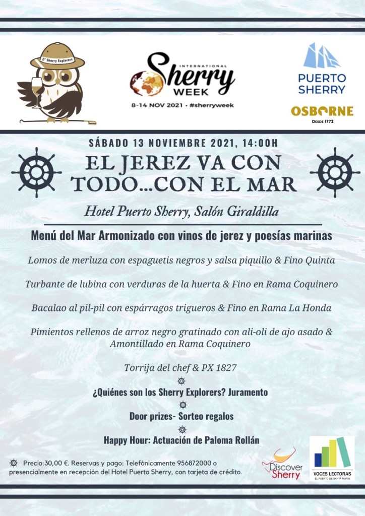 Daniel Martínez de Puerto Sherry, fue introduciendo cada uno de los exquisitos platos y Carla Terry Osborne, de la Bodega Osborne nos describió cada uno de los vinos muy especiales que había elegido para nosotros. Así mismo cada plato fue acompañado de un poema marino recitado por distintas damas de la Asociación de las Voces Lectoras de El Puerto.
