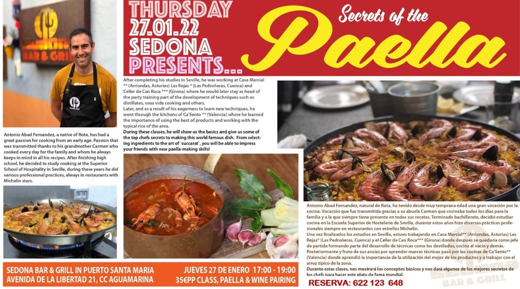Antonio Abad, Chef de Sedona Bar & Grill y futuro Sherry Explorer, enseñará los secretos de la paella y su armonización con el vino de jerez. By Discover Sherry01/18/2022 Share this: Click to share on Facebook (Opens in new window) Facebook Click to share on Pinterest (Opens in new window) Pinterest Click to share on LinkedIn (Opens in new window) LinkedIn Click to share on X (Opens in new window) X Click to email a link to a friend (Opens in new window) Email Click to print (Opens in new window) Print Like Loading... Categories: Aventuras enogastronómicas / Enogastronomical adventures, Sherry ExplorersTags: #sherrylover, Chef Antonio Abad, Discover Sherry, Sedona Bar and Grill, Sherry Explorers Related Articles FELIZ AÑO NUEVO . 2026 By Discover Sherry2 weeks ago Sherry Explorers y Amigos: By Discover Sherry3 weeks ago Día de Acción de Gracias 2025 By Discover Sherry2 months ago Leave a comment Cancel reply