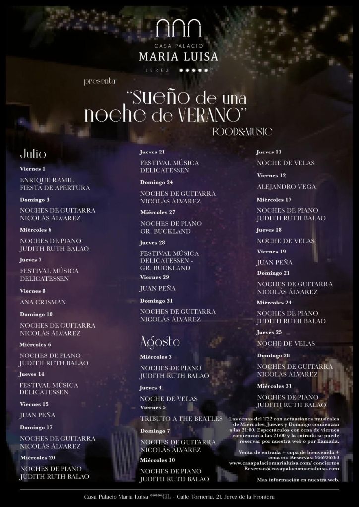 Discover Sherry Recommends: Hotel Casa Palacio María Luisa, “Sueño de una noche de Verano” By Discover Sherry06/29/2022 FOOD&MUSIC Información y reservas: https://www.casapalaciomarialuisa.com/conciertos-de-verano.html Share this: Share on Facebook (Opens in new window) Facebook Share on Pinterest (Opens in new window) Pinterest Share on LinkedIn (Opens in new window) LinkedIn Share on X (Opens in new window) X Email a link to a friend (Opens in new window) Email Print (Opens in new window) Print Like Loading... Categories: About Sherry, Aventuras enogastronómicas / Enogastronomical adventures, Events / Eventos, Recommendations, Sherry ExplorersTags: #sherrylover, Discover Sherry, FOOD&MUSIC, Hotel Casa Palacio María Luisa, Jerez de la Frontera, Sherry Explorers Related Articles FELIZ AÑO NUEVO . 2026 By Discover Sherry1 month ago Sherry Explorers y Amigos: By Discover Sherry1 month ago Día de Acción de Gracias 2025 By Discover Sherry2 months ago Leave a comment Cancel reply