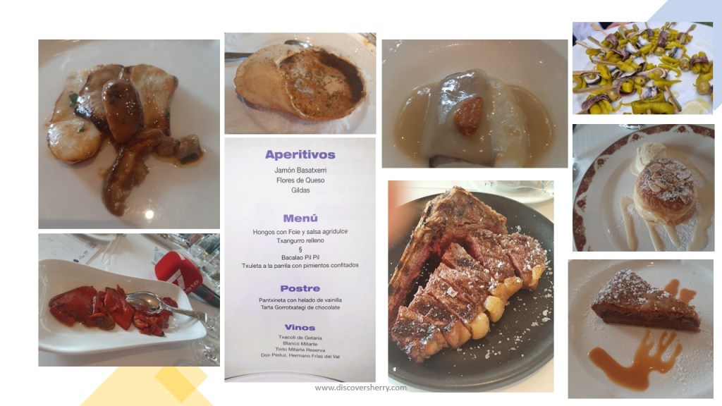 The grilled Txuletas………………were indescribably great!!! A Txuleta is an over-sized T-bone steak. The meat melts in your mouth since it is prepared to be very tender. Even one of our”vegetarian” friends enjoyed them! The desserts, the wines, ….. In short, it was a perfect meal.