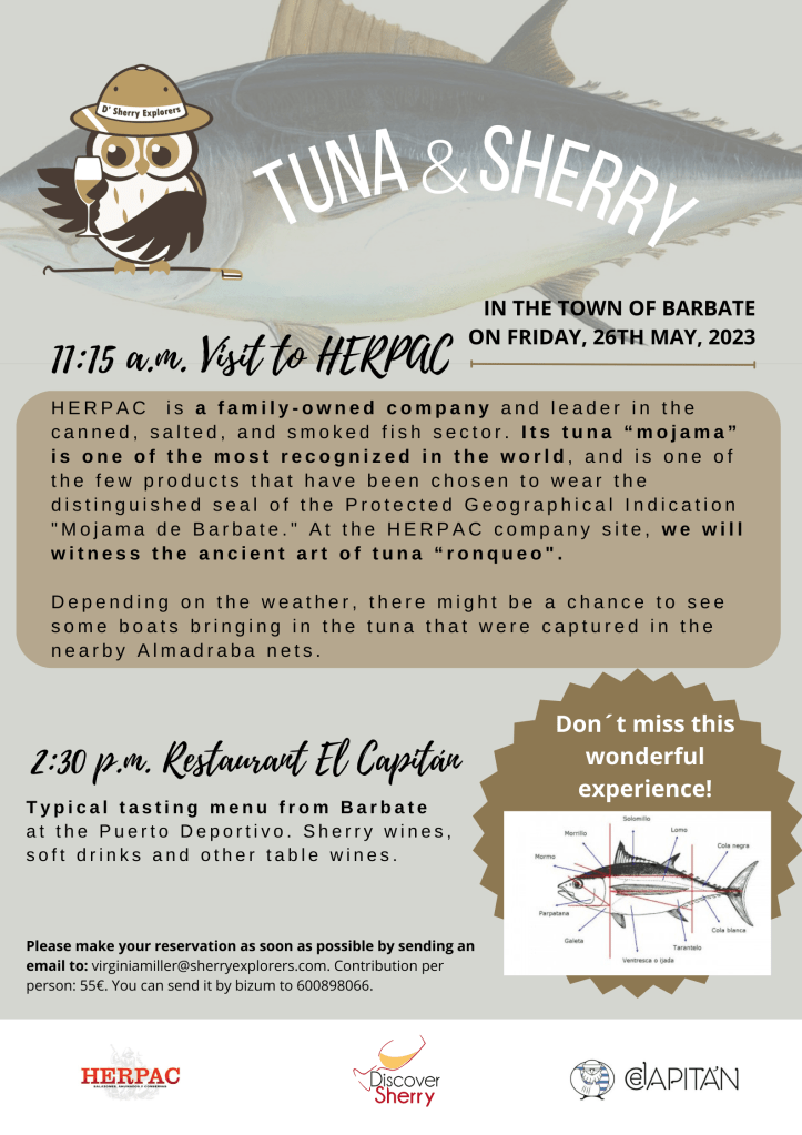 Sherry Explorers: a explorar el ATÚN & SHERRY en BARBATE. Sherry Explorers: let´s explore TUNA & SHERRY in BARBATE. By Discover Sherry05/09/2023 Share this: Click to share on Facebook (Opens in new window) Facebook Click to share on Pinterest (Opens in new window) Pinterest Click to share on LinkedIn (Opens in new window) LinkedIn Click to share on X (Opens in new window) X Click to email a link to a friend (Opens in new window) Email Click to print (Opens in new window) Print Like Loading... Categories: About Sherry, Aventuras enogastronómicas / Enogastronomical adventures, Events / Eventos, Sherry ExplorersTags: #sherrylover, Barbate, Cuarto y Mitá, Discover Sherry, Restaurante El Capitán Barbate, Sherry Explorers, Sherry wines Related Articles Sherry Explorers y Amigos: By Discover Sherry2 days ago Día de Acción de Gracias 2025 By Discover Sherry4 weeks ago Discover Sherry recommends: By Discover Sherry1 month ago Leave a comment Cancel reply