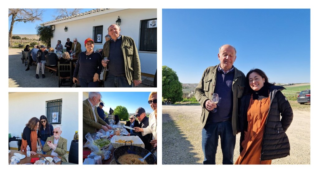 Esta es la Viña La Zarzuela donde los Sherry Explorers hacemos la vendimia bajo la dirección de José Manuel Bustillo el Vigneron. Cortamos la uva, la pisamos, hacemos la prensa y finalmente el mosto se deja reposar en una bota hasta que ha fermentado. Este mes de febrero cuando fuimos a la viña estaba muy diferente de cuando hicimos la vendimia. Probamos el mosto y estaba riquísimo.