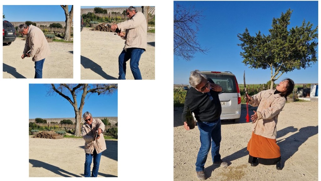 Busti abriendo una botella de vino de burbujas y luego enseñando a Momoko a hacerlo y con un sable!!! Busti is shown here opening a bottle of bubbly wine and teaching Momoko how to do the same with a saber!!!!!