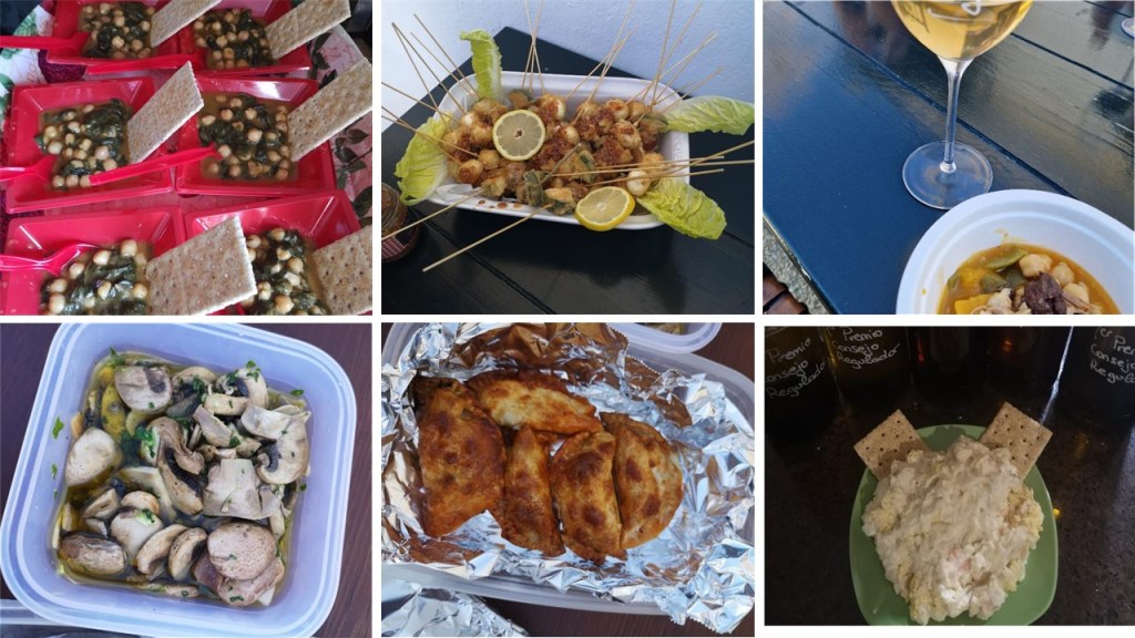 Acompañamos el mosto con buenísimas tapas que aportamos los incansables exploradores del vino y brandy de jerez y manzanilla de Sanlúcar. Pinchitos japoneses, rollitos de salmón ingleses, berza, espinacas con garbanzos, migas, ensaladilla de gambas, guacamole, chorizo, empanadillas, champiñones y postres y más cositas.