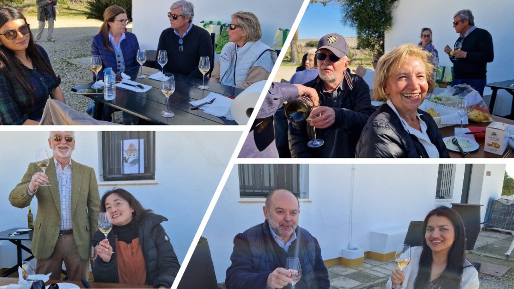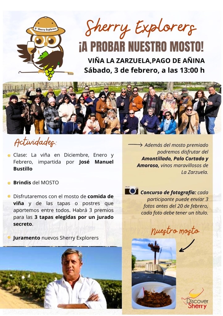 This is La Zarzuela Vineyard where the Sherry Explorers conducted their harvest under the direction of José Manuel Bustillo, the Vigneron (Winemaker). We cut the grapes, crushed them, pressed them and finally the wine must was left to rest in a barrel until it had fermented. This February when we saw the vineyard, it was completely different from when we had finished our harvest. This time, we tried the fermented wine-must and it was delicious.